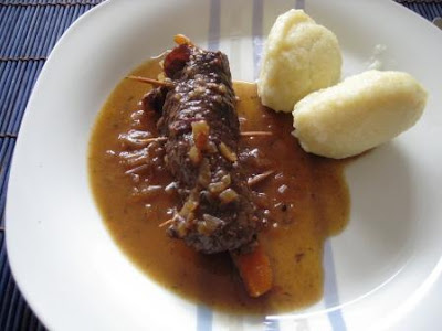 the steaks and brush with Snf and top with bacon. Sliced cucumbers and carrots create an end (about a cucumber & 1 / 2 per carrot pulp), they beilden the core of the roll. Then everything wrap and secure with toothpicks. Rest in the refrigerator lassen.Vor salt and pepper the roast and then sharply to dark brown on 2 sides with some oil and took it out of pan. Sauté onion in the pan and pour in the geleichen red wine. to stir 2 tablespoons sugar and boil everything a little. Then pour 1/2L with soup or water / stock cube and season with the herbs (it could be a different mixture of spices are used). garlic cook yourself or (if a stronger garlic flavor is desired) pressed into the sauce. can to achieve a darker sauce to simmer the onion skins or: